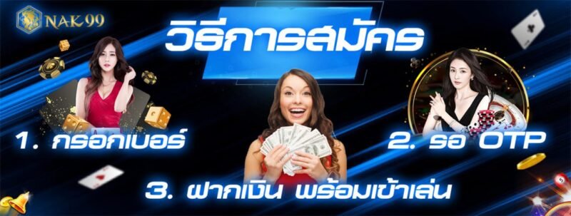 ไปที่หน้าเว็บไซต์ทำการเลือกเมนูสมัครสมาชิกซึ่งปกติจะอยู่ที่มุมบนของหน้าจอ ทำการกรอกข้อมูลส่วนตัว ได้แก่ ชื่อ นามสกุล เบอร์โทรศัพท์ เลขที่บัญชีธนาคาร หรือ nak99 วอเลท ระบบ True wallet ที่จะใช้ในการฝากถอนและทำธุรกรรมทางการเงิน